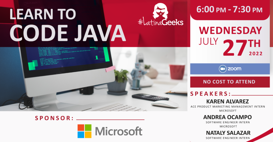 #LatinaGeeks invites you to join Microsoft and us for an interactive Java coding workshop that will teach the fundamental concepts of object-oriented programming and the Java programming language to those with little to no prior coding knowledge.